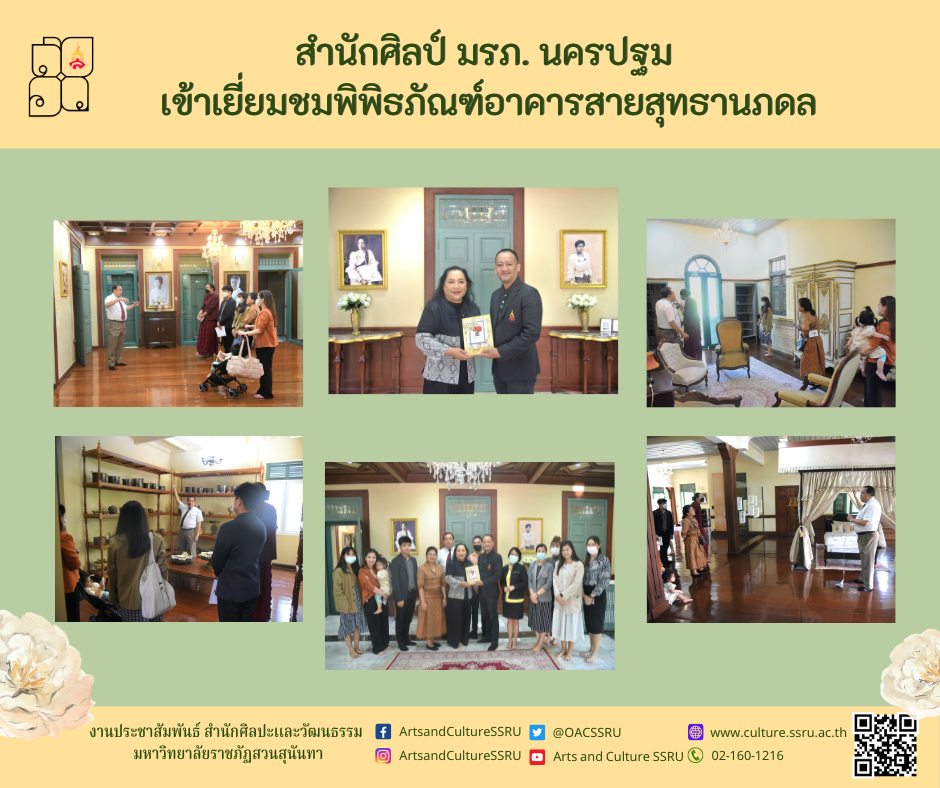 On 22 June 2023, Dr.Peerapol Chatchawan, Director of the Office of Arts and Culture, SSRU and personnel of OAC, SSRU welcomed Dr.Pranrapee Boonplian, Director of the Office of Arts and Culture, Nakhon Pathom Rajabhat University and personnel along with visitors who interested in history on the occasion of visiting and learning history at Sai Suddha Nibhadol Building Museum, the historical heritage of Suan Sunandha.