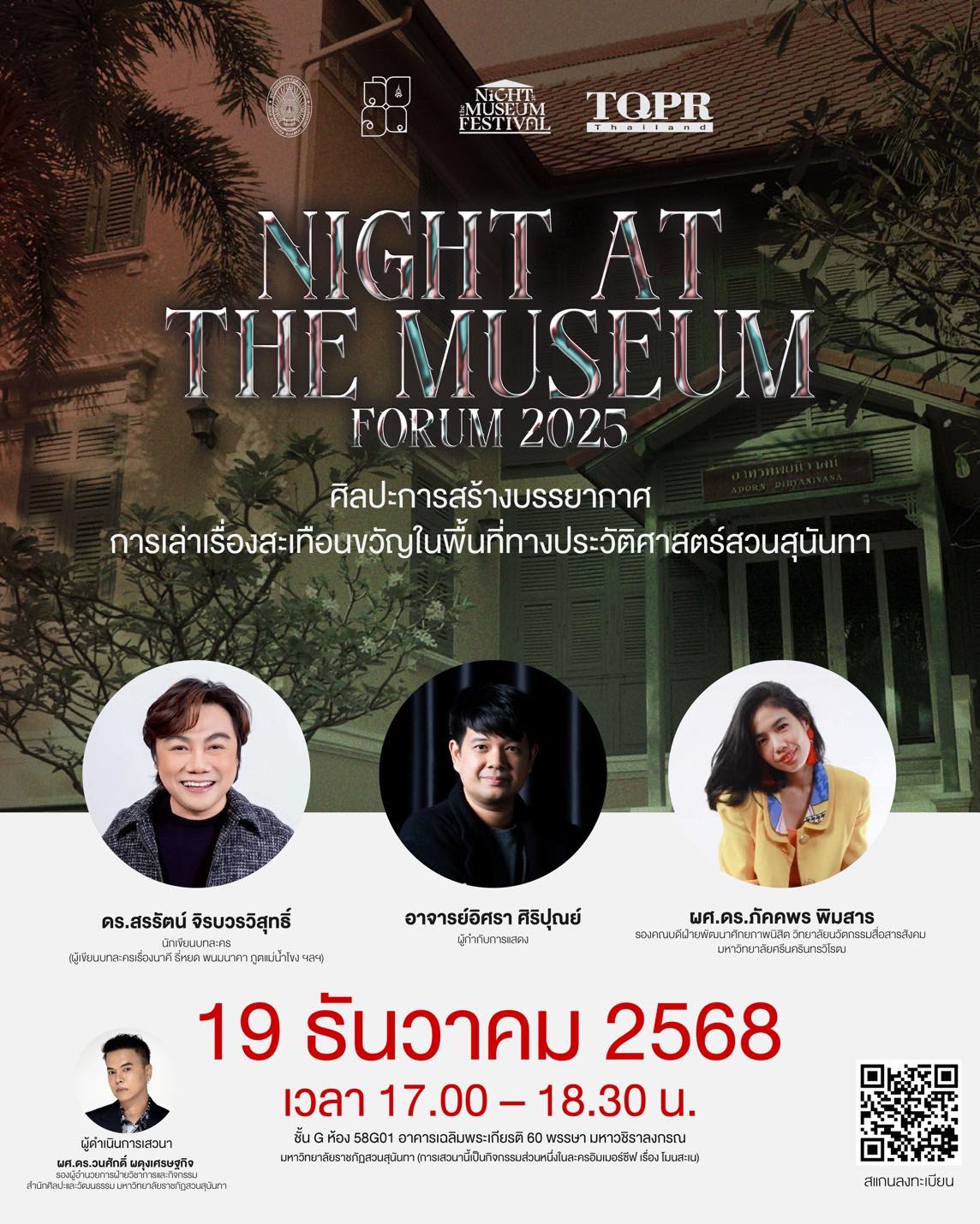 สำนักศิลปะและวัฒนธรรม มหาวิทยาลัยราชภัฏสวนสุนันทา ขอเชิญผู้สนใจเข้าร่วมกิจกรรมเสวนาวิชาการในงาน Night at The Museum Festival 2025 ในหัวข้อ “ศิลปะการสร้างบรรยากาศ การเล่าเรื่องสะเทือนขวัญในพื้นทางประวัติศาสตร์สวนสุนันทา” ซึ่งมุ่งสำรวจแนวคิด กระบวนการสร้างประสบการณ์ทางอารมณ์ และการตีความเชิงสร้างสรรค์ผ่านงานศิลปะการแสดงและบทละครแนวสยองขวัญ โดยเฉพาะเมื่อต้องทำงานกับ “พื้นที่จริง” ที่มีประวัติศาสตร์ซ้อนทับอยู่
