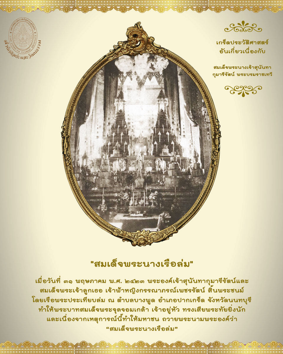 เมื่อวันจันทร์ที่ 31 พฤษภาคมพ.ศ. 2423 พระบาทสมเด็จพระจุลจอมเกล้าเจ้าอยู่หัวมีพระบรมราชโองการให้แต่งเรือพระที่นั่งเพื่อเสด็จประพาสพระราชวังบางปะอินพร้อมพระมเหสีทุกพระองค์ เจ้าจอมมารดา เจ้าจอม และข้าราชบริพาร โดยก่อนวันเสด็จพระราชดำเนินนั้น พระองค์เจ้าสุนันทากุมารีรัตน์ทรงพระสุบิน (ฝัน) ว่า พระองค์พร้อมด้วยสมเด็จพระเจ้าลูกเธอ เจ้าฟ้าหญิงกรรณาภรณ์เพชรรัตน์ฯ ทรงพระดำเนินข้ามสะพานแห่งหนึ่ง สมเด็จพระเจ้าลูกเธอ เจ้าฟ้าหญิงกรรณาภรณ์เพชรรัตน์ฯ ทรงพลัดตกน้ำลงไป พระองค์สามารถคว้าพระหัตถ์เอาไว้ได้ แต่พระหัตถ์ของสมเด็จพระเจ้าลูกเธอฯ ก็ลื่นหลุดจากพระหัตถ์พระองค์ไป พระองค์ทรงคว้าพระหัตถ์พระเจ้าลูกเธอจนทรงตกลงไปในน้ำด้วยกันทั้ง ๒ พระองค์ ถึงแม้ว่าพระองค์จะทรงหวั่นพระทัย แต่ก็มิได้ทรงกราบบังคมทูลให้พระราชสวามีทรงทราบ และได้ตามเสด็จฯ ประพาสพระราชวังบางปะอินตามพระราชประสงค์
